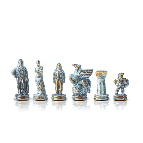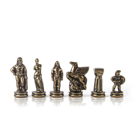Leonidas (Pawn) is depicted armed for battle, holding his notorious shield with the greek letter Λ (L) engraved. The King represents the famous semi-god hero, Hercules, the son of Zeus, and the Knight of the famous winged horse, Pegasus. The Queen figure is a replica of the famous statue Aphrodite of Milos (200 B.C.) and the Bishop is Apollo, from the Temple of Zeus in Olympia (460 B.C.). The Castle is inspired by the Doric pillars of the Parthenon on the Acropolis (440 B.C.)