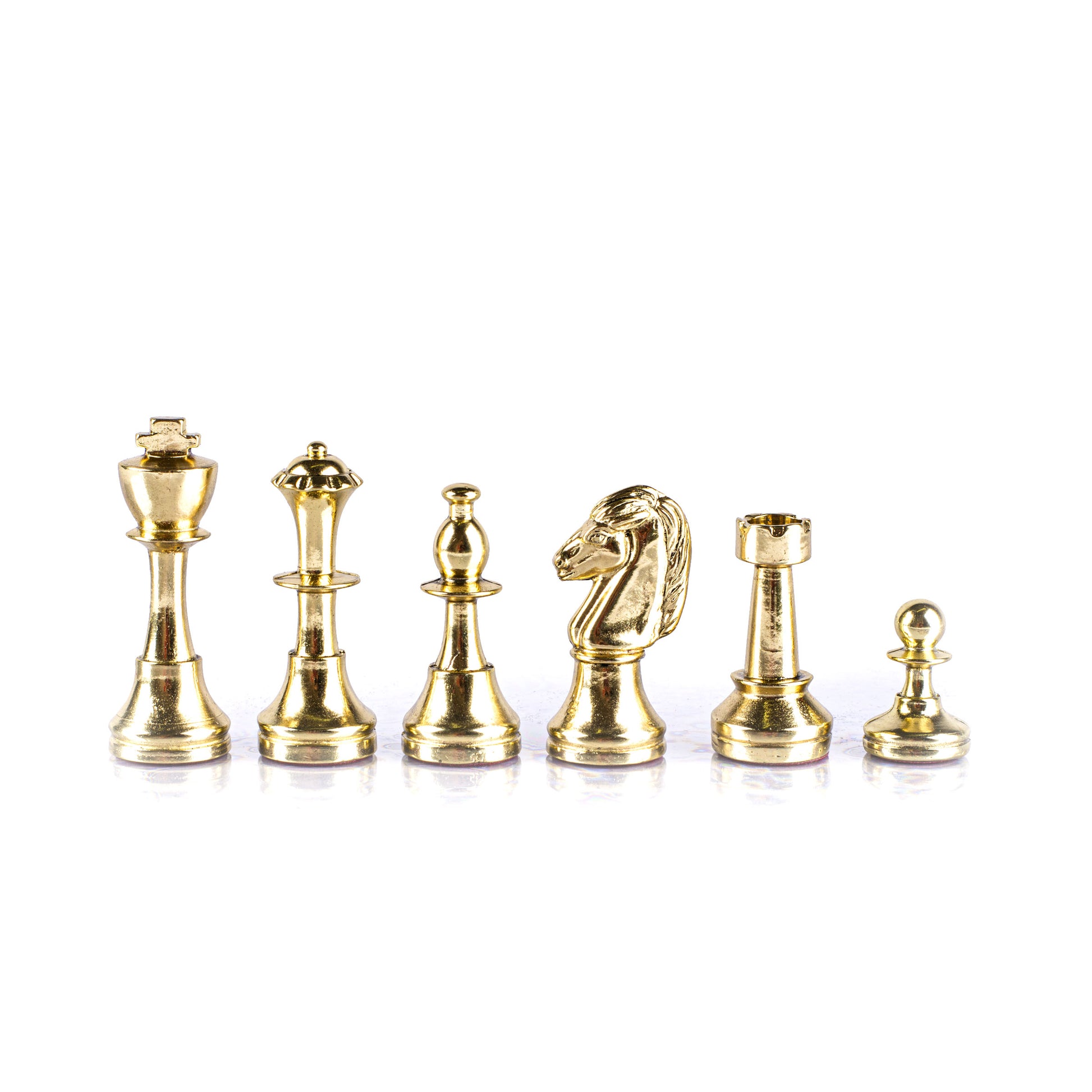 Staunton-schackpjäserna, de vi känner och älskar, de vi helt enkelt tänker på som schackpjäser. Dessa klassiska schackpjäser är uppkallade efter Howard Staunton som allmänt ansågs vara en av de bästa spelarna i världen. Riddaren, den mest invecklade och distinkta pjäsen i alla schackspel, är ett realistiskt snidat hästhuvud. Staunton Knight var troligen inspirerad av en skulptur på den östra frontonen av Parthenon. Metal Staunton från Manopoulos förstärker originalets arkitektoniska historia samtidigt som de respekterar deras tidlösa design.